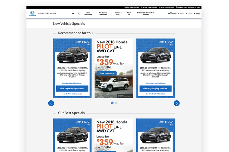 Our Specials and Incentives solution helps you promote your most important marketing messages to shoppers browsing your homepage, inventory, service and specials pages. Deploy creative featuring OEM incentives automatically via your existing OEM feed. Or, build your own ads right from ControlCenter, and deploy them instantly across your website or multiple rooftops.