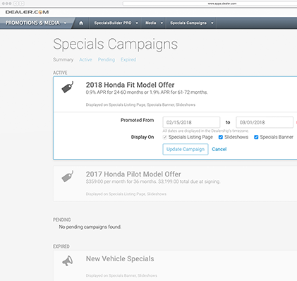 Dealer.com’s dynamic content targeting engine ensures that the most relevant ads, banners, and slideshows from Specials Campaign Manager are automatically displayed adjacent to recommended inventory. Creative is deployed in real-time to your homepage and vehicle listings pages, as well as promotions and fixed operations pages by default, but these assets can be configured to display to the locations on your website that best match your strategy.
